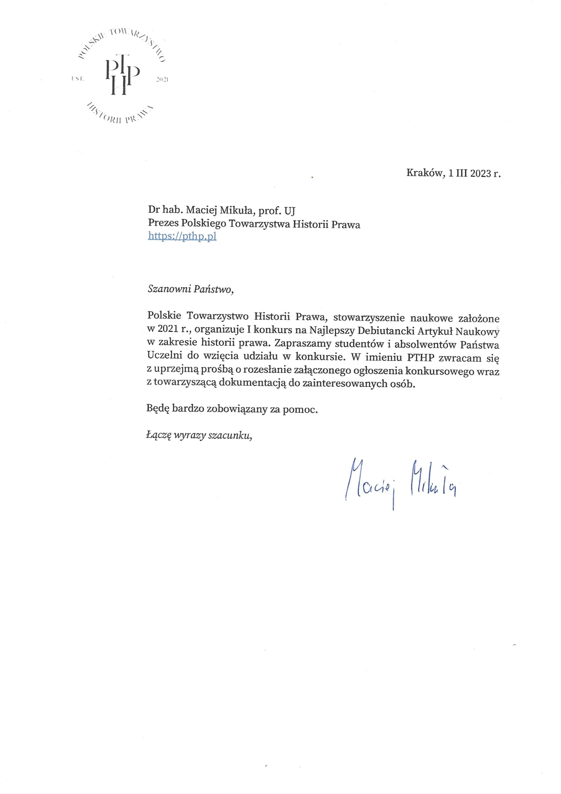 W imieniu Zarządu Towarzystwa oraz Komisji Dydaktyki PTHP mam zaszczyt i przyjemność przesłać Państwu informację dotyczącą organizowanego przez Towarzystwo konkursu na artykuł naukowy w zakresie historii prawa napisany przez studenta lub absolwenta studiów historycznych lub prawniczych (do dwóch lat od ukończenia studiów).