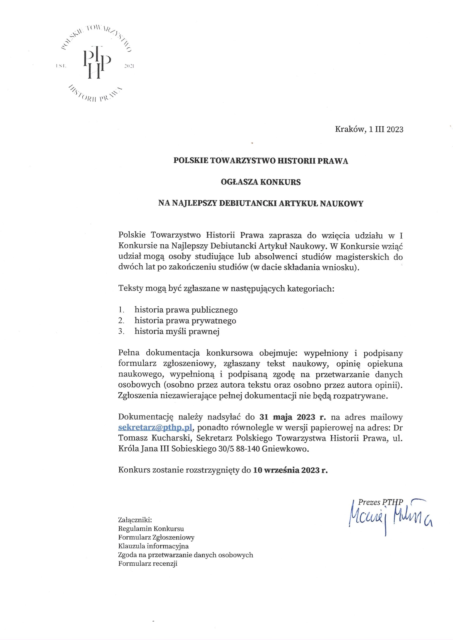W załączeniu znajdą Państwo List Prezesa PTHP – prof. Macieja Mikuły zapraszający do udziału w konkursie, a także ogłoszenie konkursowe i regulamin, gdzie wyjaśnione zostały szczegółowe zasady i warunki uczestnictwa w Konkursie. Pragniemy zwrócić uwagę, że udział w Konkursie wymaga m.in. wypełnienia i podpisania formularza zgłoszeniowego oraz dokumentów z zakresu ochrony danych osobowych (RODO). Wszelkie wymagane formularze odnajdą Państwo wśród załączników.