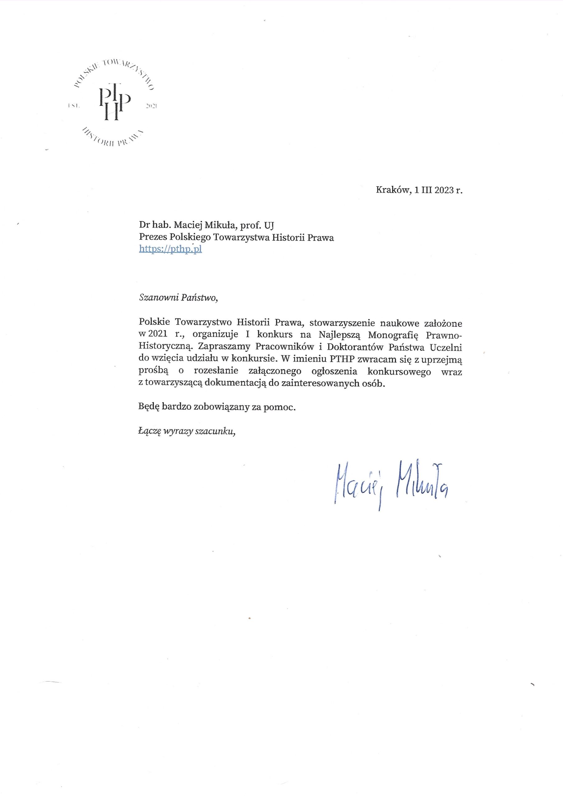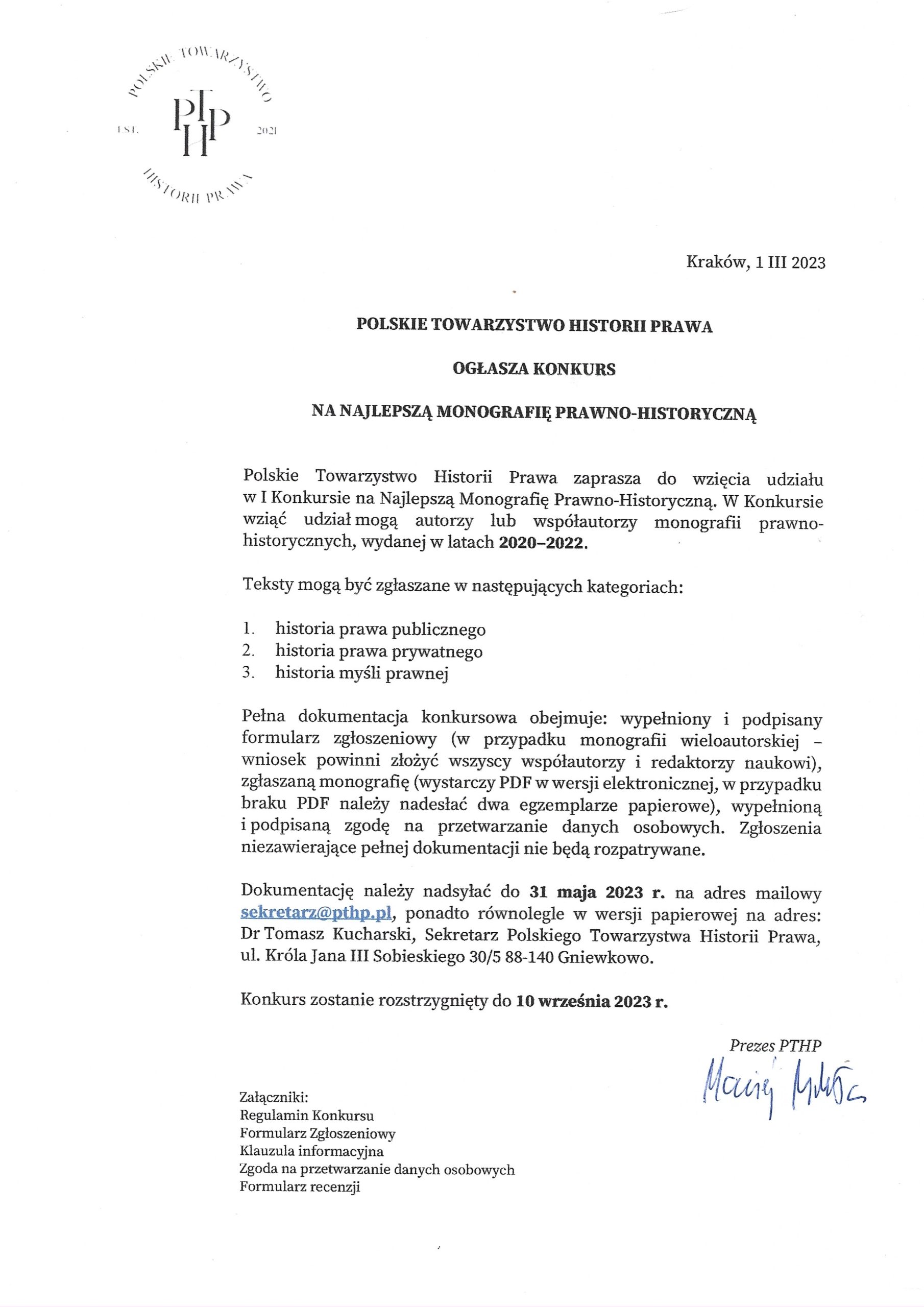 W imieniu Zarządu Towarzystwa oraz Komisji Nauki PTHP mam zaszczyt i przyjemność przesłać Państwu informację dotyczącą organizowanego przez Towarzystwo Konkursu na najlepszą monografię naukową w zakresie historii prawa wydaną w latach 2020-2022. Celem konkursu jest propagowanie i doskonalenie badań w zakresie historii prawa, a także promowanie dobrych praktyk w zakresie tworzenia wartościowych prac naukowych.